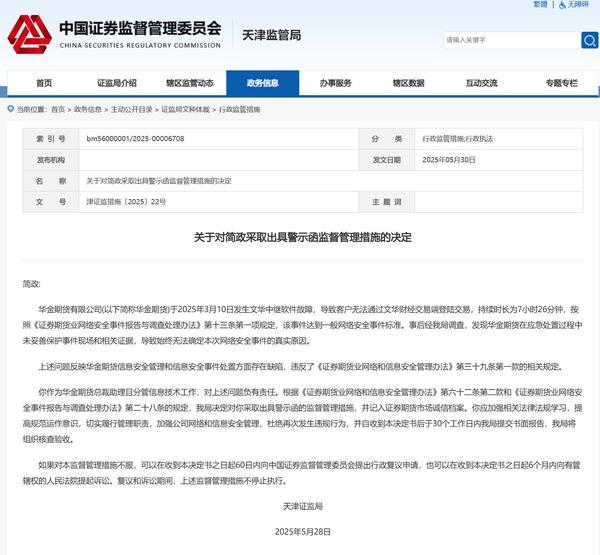 中国网财经5月30日讯 今日,天津证监局公布相关行政监管措施,华金期货有限公司(简称“华金期货”)于2025年3月10日发生文华中继软件故障,导致客户无法通过文华财经交易端登陆交易,持续时长为7小时26分钟,按照《证券期货业网络安全事件报告与调查处理办法》第十三条第一项的规定,该事件达到一般网络安全事件标准。事后经天津证监局调查,发现华金期货在应急处置过程中未妥善保护事件现场和相关证据,导致始终无法确定本次网络安全事件的真实原因。