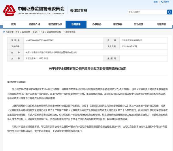 天津证监局表示,上述问题反映华金期货信息安全管理和信息安全事件处置方面存在缺陷,违反了《证券期货业网络和信息安全管理办法》第三十九条第一款的相关规定。根据《证券期货业网络和信息安全管理办法》第六十二条第二款和《证券期货业网络安全事件报告与调查处理办法》第二十八条的规定,天津证监局决定对华金期货采取责令改正的监督管理措施,并记入证券期货市场诚信档案。华金期货应进一步加强网络和信息安全管理,切实提高系统运维保障能力和故障原因排查能力,完善信息安全应急处理工作机制,杜绝再次发生违规行为,并自收到本决定书后于30个工作日内向天津证监局提交书面报告,天津证监局将组织核查验收。