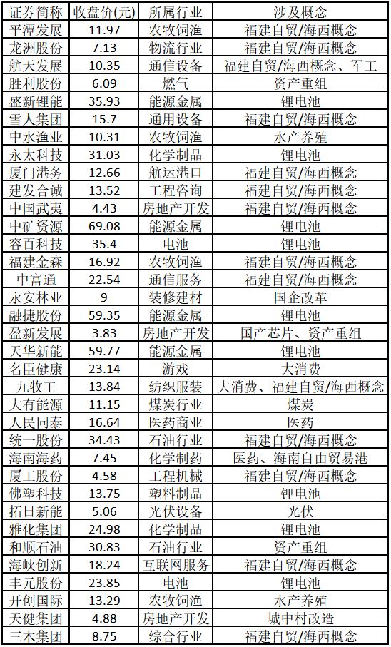 涨停板个股中,股价创出近一年新高的个股有35只(不包括创出历史新高的个股),包括平潭发展、龙洲股份、航天发展、胜利股份、盛新锂能、雪人集团、中水渔业、永太科技、厦门港务、建发合诚、中国武夷、中矿资源、容百科技、福建金森、中富通、永安林业、融捷股份、盈新发展、天华新能、名臣健康、九牧王、大有能源、人民同泰、统一股份、海南海药、厦工股份、佛塑科技、拓日新能、雅化集团、和顺石油、海峡创新、丰元股份、开创国际、天健集团、三木集团,具体如下表所示。