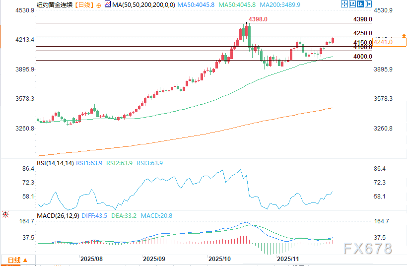 技术面来看,2月黄金期货多头的下一个上行目标是收盘价突破关键阻力位——11月高点4285.60美元/盎司;空头的短期下行目标是推动期货价格跌破关键技术支撑位4000.00美元/盎司。第一阻力位见于4250.00美元/盎司,随后是4285.60美元/盎司;第一支撑位为隔夜低点4174.60美元/盎司,其次是4150.00美元/盎司。