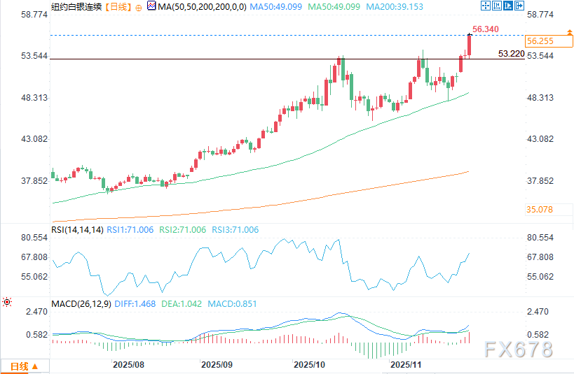 汇通财经APP讯——周五(11月28日)美国早盘交易中,黄金和白银价格走高,其中白银期货大幅上涨并创下历史新高。受技术图表形态推动,两种金属本周短期技术面均呈现更强看涨态势。2月交割黄金期货上涨38.8美元,报4241.1美元/盎司;3月交割白银期货上涨2.608美元,报56.215美元/盎司。500)this.width=500 align=center hspace=10 vspace=10 rel=nofollow/>