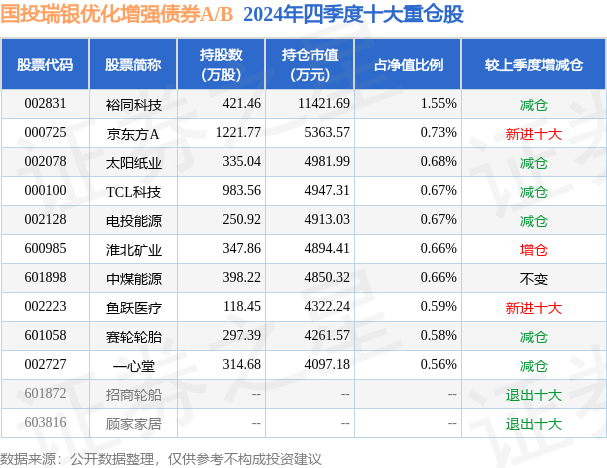 国投瑞银优化增强债券A/B为债券型-混合二级基金,根据最新一期基金季报显示,该基金资产配置:股票占净值比14.99%,债券占净值比103.5%,现金占净值比0.29%。基金十大重仓股如下: