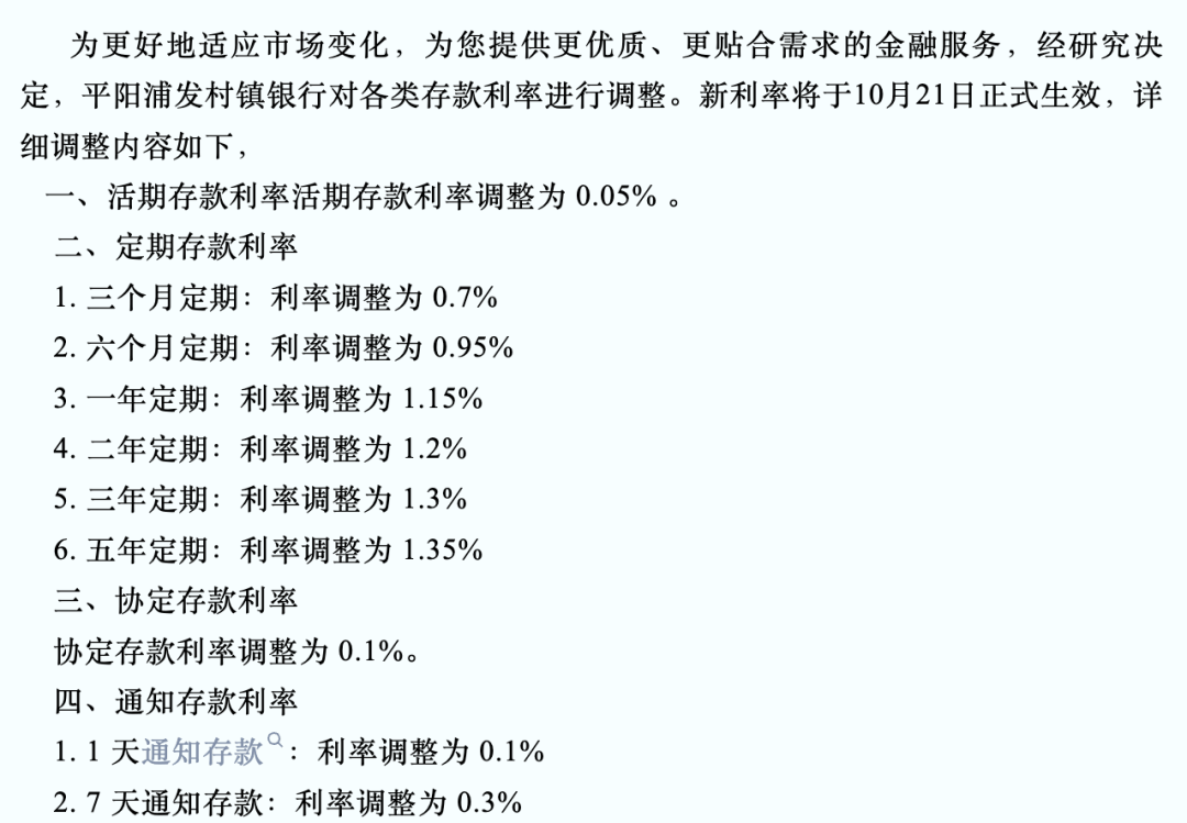 例如,平阳浦发村镇银行10月20日发布公告称,该行将对各类存款利率进行调整,新利率将于10月21日生效。与该行上一次公开发布的存款利率信息相比,本次调整后,活期产品下调20个基点,降至0.05%;定期产品中,三个月期、六个月期、一年期、二年期、三年期、五年期分别下调40个、35个、35个、50个、80个、80个基点;协定存款和通知存款利率也均有不同程度下调。