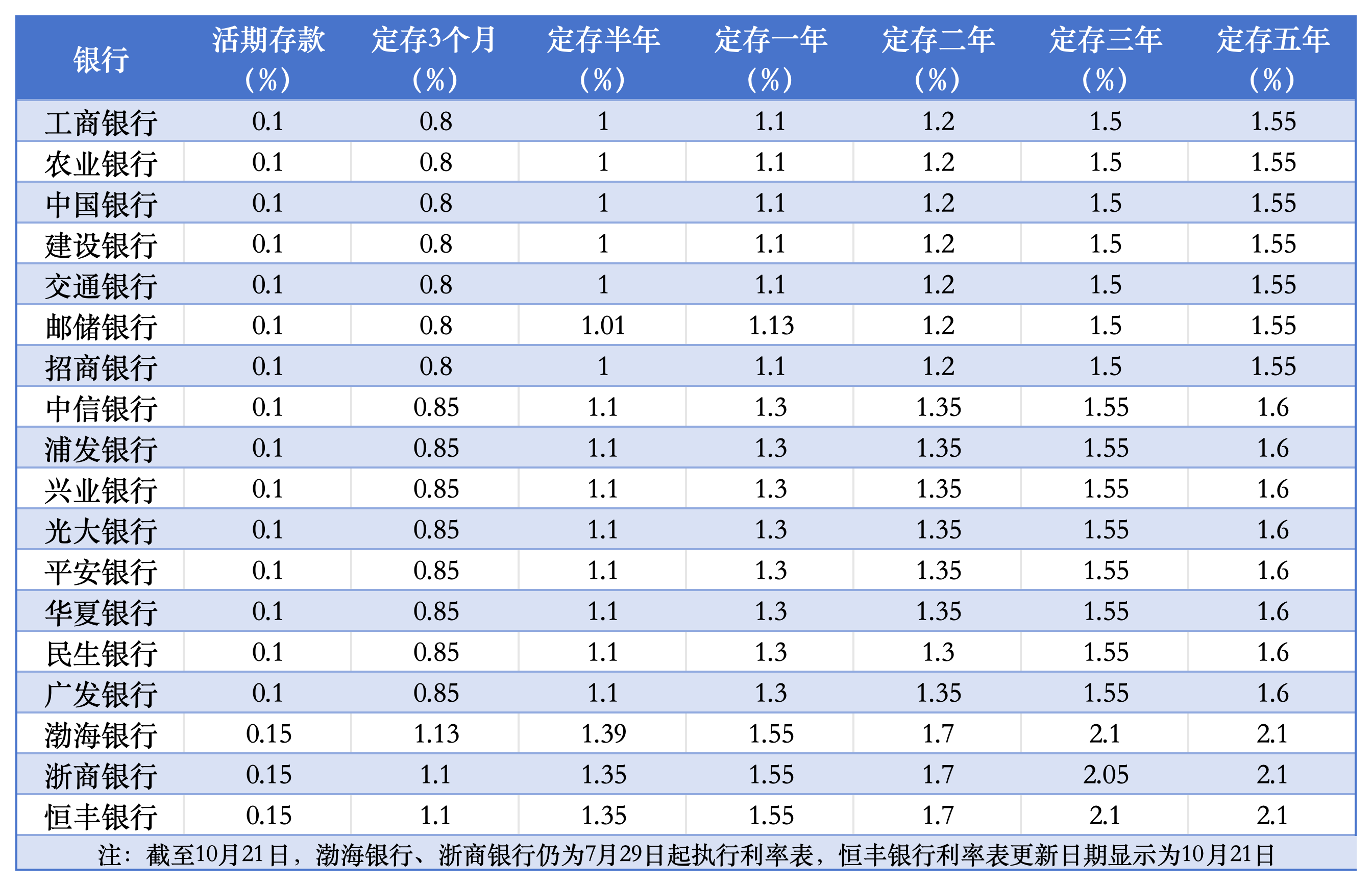尚未进行新一轮利率调整的渤海银行、浙商银行、恒丰银行,定存执行利率仍可超过2%。