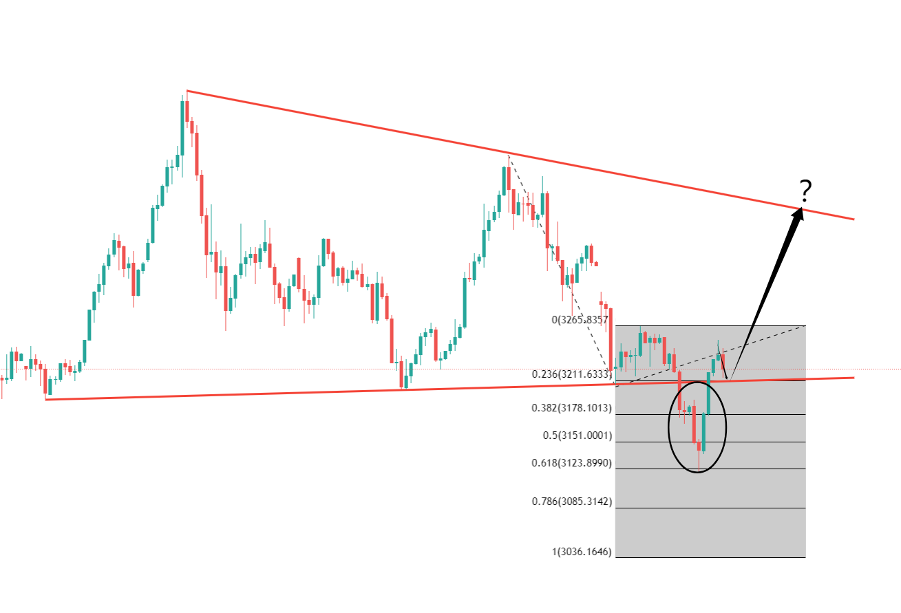 所以在今天早上,我一度怀疑昨天下跌子是个假破位你知道吗?先来说价格破位,我们都知道3200点很重要,就算它当时超跌再多,但迅速收复就只能说明它只是个单纯的价格破位而已,你没办法临时直接确定,再者就是结构破位,本来它就是个楔形整理通道,刚好下方的水平支撑线点整数,但后续V型反弹是已经让价格再度回归到了通道内的,这个价格不是3200,而是3215,周期在往后推,你价格自然也会往上移。