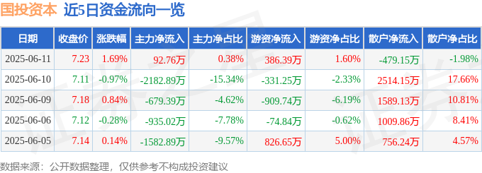证券之星消息,截至2025年6月11日收盘,国投资本(600061)报收于7.23元,上涨1.69%,换手率0.52%,成交量33.48万手,成交额2.42亿元。