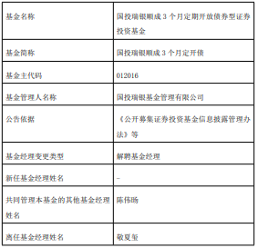 敬夏玺离任国投瑞银顺成3个月定开债