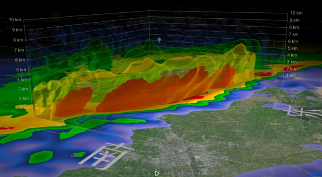 3月2日,江苏淮北地区出现雷暴大风和短时强降水天气。基于项目自主研发的雷达三维可视化系统,气象部门对风暴三维结构进行实时反演,淮安、盐城等地提前30分钟至1小时发布预警信息,助力当地应急管理部门迅速转移沿海作业人员。
