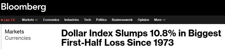 FX168财经报社(亚太)讯 今年上半年,美元指数大幅下跌,创下自1973年以来最糟糕的上半年表现;当时理查德·尼克松(Richard Nixon)担任美国总统。