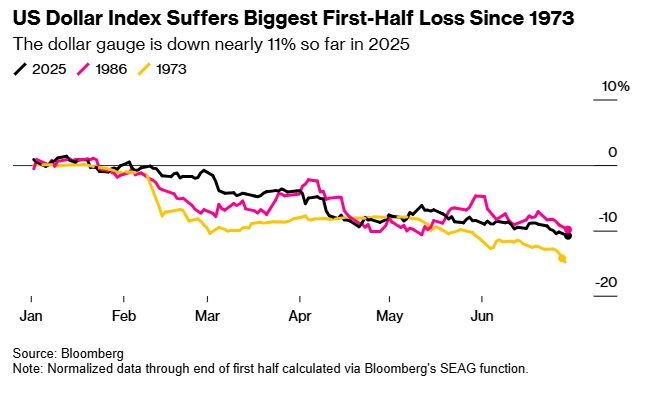 美元指数今年迄今已下跌约10.8%,而1973年上半年则下跌14.8%。