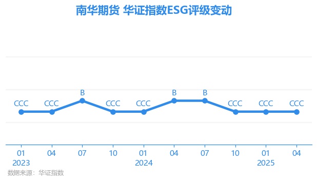 日前,华证指数公布了新一期(2025年4月30日)的ESG评级结果,南华期货(603093.SH)获得CCC评级(华证指数评级为C起至AAA九档,C为最低档,AAA为其最高一级评级/AA为其第二档),上一期(2025年1月31日)ESG评级为CCC。本期ESG评级在22家金融服务行业A股上市公司中排名第9(上一期排名第9)。
