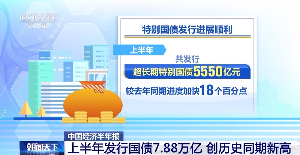 特别国债发行进展顺利。上半年共发行超长期特别国债5550亿元,较去年同期进度加快18个百分点。用于支持国有大型商业银行补充核心一级资本的5000亿元中央金融机构注资特别国债,于4月下旬至6月上旬分4次如期发行完毕。