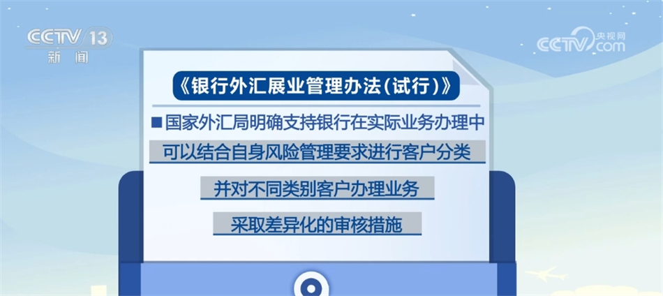 国家外汇管理局管理检查司司长 胡春雨:银行和企业自愿选择适用《展业办法》或其他现行外汇管理政策,政策适用更灵活;银行可以基于对客户的风险识别进行客户分类,优质客户能够一揽子享受便利化政策,可凭指令办理外汇业务,(银行)对高风险客户和业务匹配更多展业资源,有效拦截、防控风险。