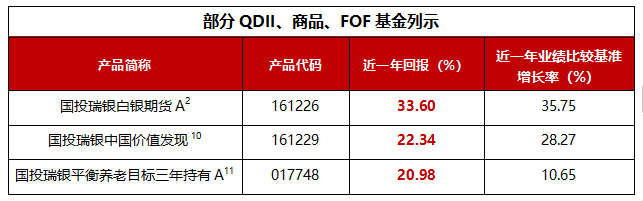 除传统的了权益领域,国投瑞银基金在QDII、商品、FOF等领域也均有突出。其中,国投瑞银中国价值发现QDII,主要投资于具有“中国概念”的企业在中国内地以及海外证券市场发行的证券,近一年回报22.34%;国投瑞银白银期货A,在贵金属涨势中表现出色,近一年回报33.60%;另外,国投瑞银平衡养老目标三年持有A,近一年回报20.98%,助力 “养老长钱”的投资。