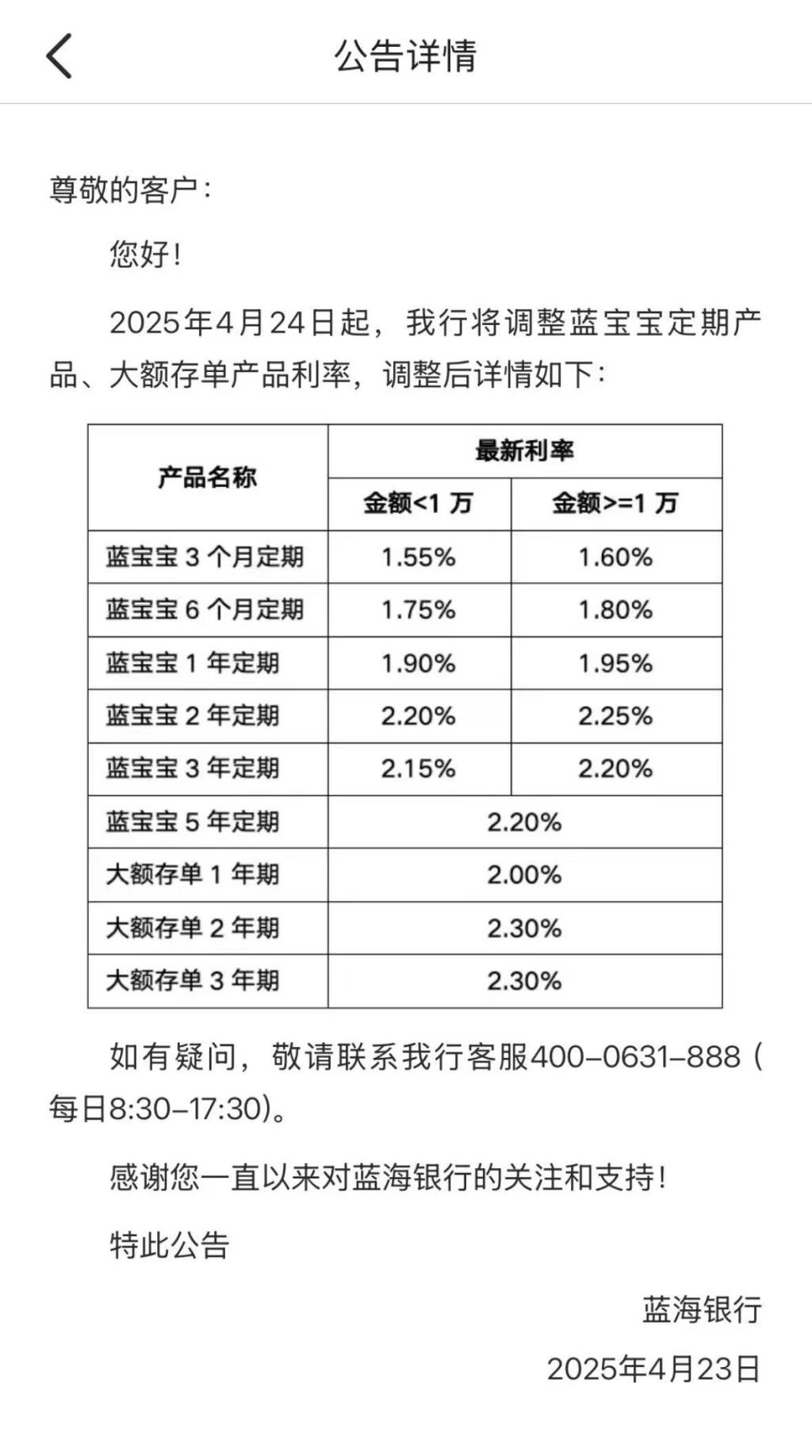 4月24日,蓝海银行将其2年定期(金额<1万)、2年定期(金额>1万)、3年定期(金额<1万)、3年定期(金额>1万)、5年定期、大额存单3年期利率分别调整至2.2%、2.25%、2.15%、2.2%、2.2%、2.3%。2年定期、3年定期、5年定期、大额存单3年期产品利率较此前分别下调20个、15个、10个、10个基点。