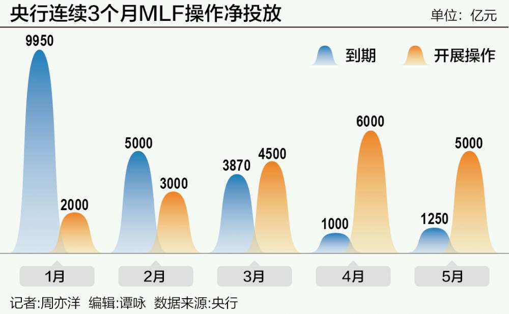 5月23日,央行开展5000亿元MLF操作,期限为1年期。由于5月15日,MLF到期规模为1250亿元。由此,5月MLF操作将实现净投放3750亿元。这是央行连续第三个月加量续作,也是连续第二个月大额加量续作。