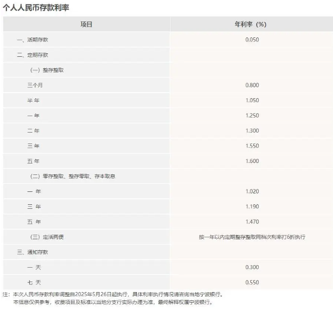 宁波银行5月26日调整后的利率相对较高,3个月期、6个月期、1年期、2年期、3年期、5年期整存整取存款挂牌利率分别为0.80%、1.05%、1.25%、1.30%、1.55%、1.60%。