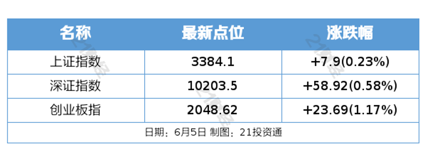 6月5日,A股三大指数震荡反弹,截至收盘,上证指数涨0.23%,深证成指涨0.58%,创业板指涨1.17%。
