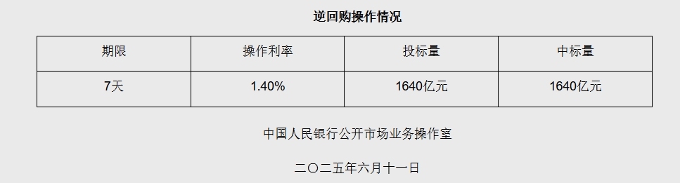 据央行网站消息,2025年6月11日中国人民银行以固定利率、数量招标方式开展了1640亿元逆回购操作。
