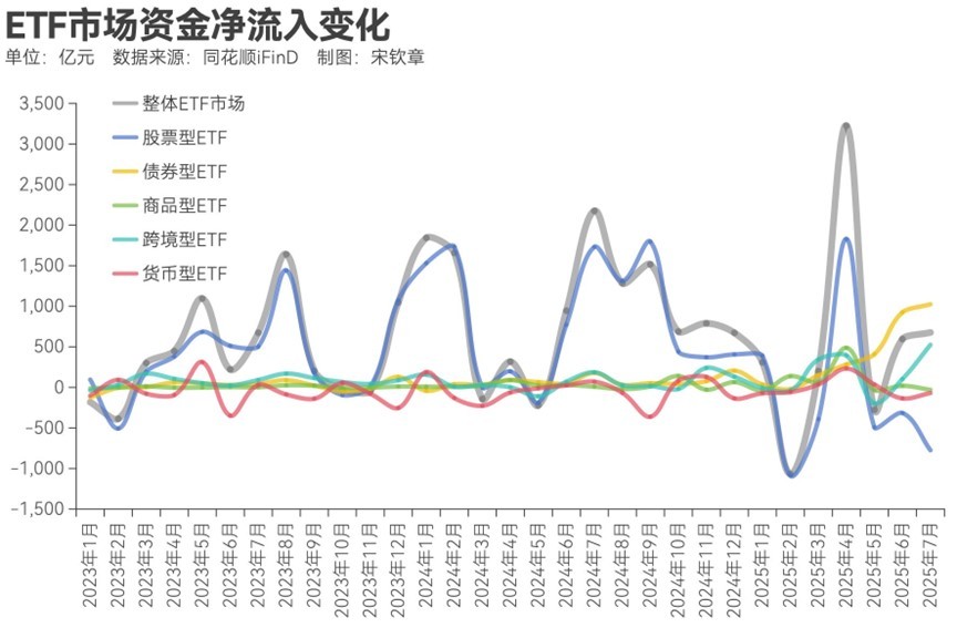 尽管股票型ETF仍然主导ETF市场,但从全市场资金流向的变化来看,债券型ETF正在成为增量资金的“吸金主力”。今年5月以来,债券型ETF的资金净流入开始明显超过其他类型的ETF,并持续保持领先。根据同花顺iFinD数据,今年7月份债券型ETF市场的资金净流入首次超过了1000亿元。