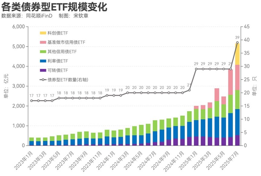 去年年底,全市场债券型ETF的数量共有21只,整体规模不到2000亿元。而截至今年7月底,债券型ETF的数量已扩容至39只,且规模达到了5160.29亿元。债券型ETF在整体ETF市场规模中的占比,也从2024年底的不到5%跃升到了如今的10%以上。